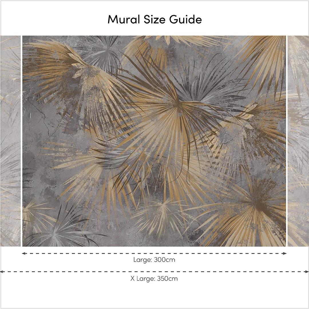 Get ready to bring the tropical vibes straight into your space with this palm leaf print. This stunning leafy canopy will transport you to a lush paradise! Stand back and appreciate a fusion of smokey grey and illuminous gold tones, where palm leaves fan out and seamlessly blend into one another. This mural captures the essence of nature's beauty, as well as some sophisticated opulence perfect for modern interiors. Whether you're looking to revamp your living room, bedroom, or even your office, this mural will instantly transform any space into a serene retreat. So go ahead and create an awe-inspiring focal point in your favourite room, whether you want to escape the hustle and bustle of everyday life or simply add a touch of nature's elegance to your space, this palm leaf mural is here to make your dreams come true.