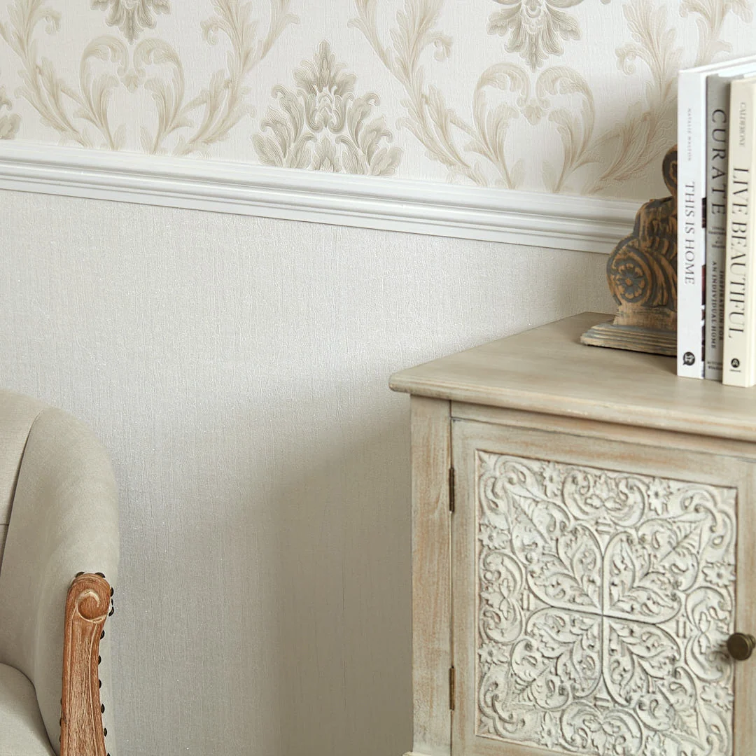 This soothing ivory design with shades of silver has a gentle textured finish and can be used on all four walls, or coordinates beautifully with our Aurora Damask in ivory with shades of silver. Style with soft colours, delicate textures, and antique furniture to create a warm and inviting atmosphere in your home.