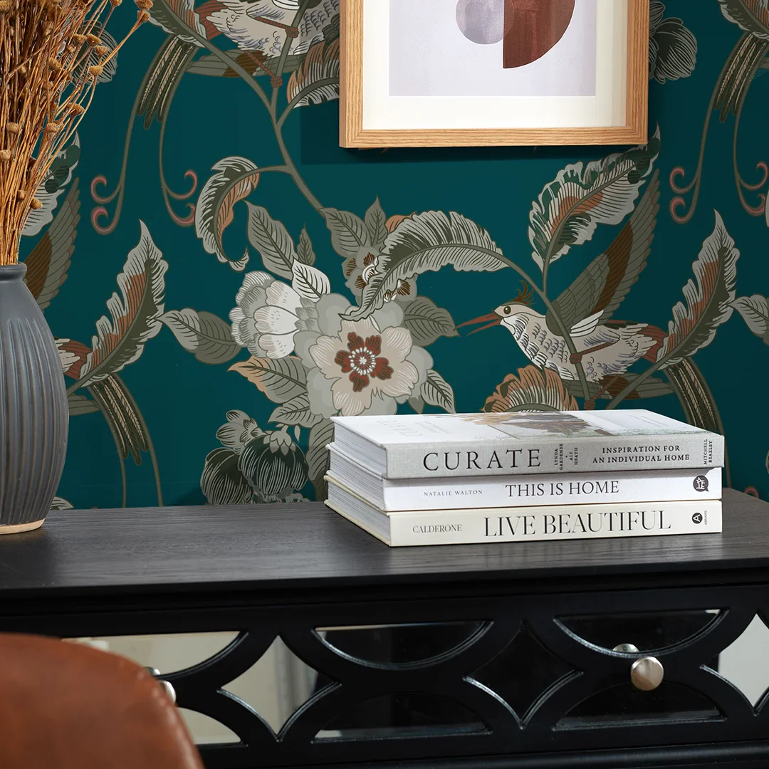Beautiful Birds wallpaper is a true work of art, featuring large billowing leaves and flowers spread across a rich, bottle-green background. The intricate design of this wallpaper is brought to life with the addition of majestic birds perching among the branches, blending seamlessly into the surroundings. This wallpaper is perfect for adding a touch of nature and serenity to any room in your home. The birds and lush foliage create a sense of calm and tranquillity, making it an ideal choice for bedrooms or living rooms. Additionally, this wallpaper's intricate design and attention to detail make it a beautiful focal point in any space. Beautiful Birds wallpaper is an excellent choice whether you're looking to refresh a tired room or create a rejuvenating new look altogether.