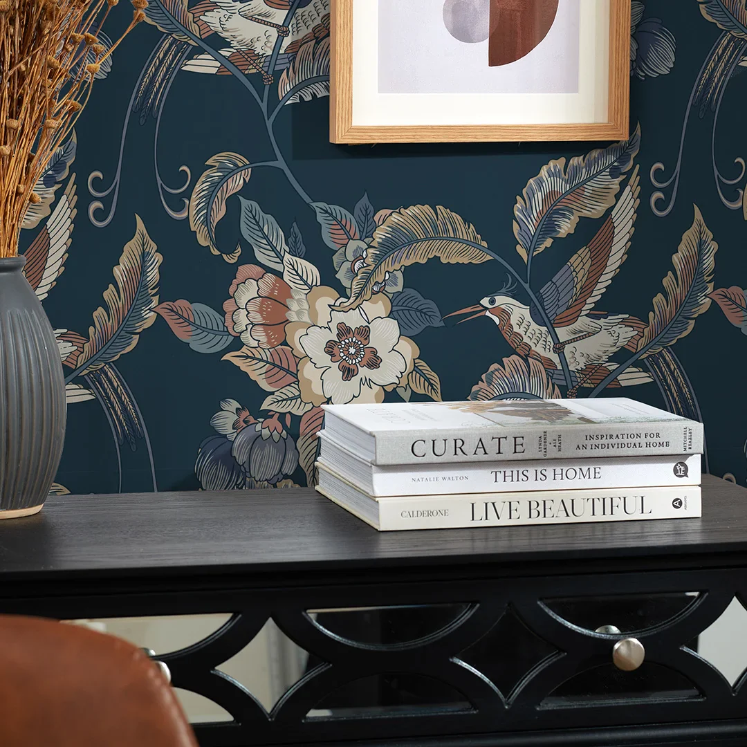 Beautiful Birds wallpaper is a stunning addition to your home decor that will capture your imagination. This wallpaper features large billowing leaves and flowers erupting across a deep navy blue background, creating a luxurious and dramatic atmosphere in any room. What sets Beautiful Birds apart from other wallpaper designs is the lifelike depiction of birds perching among the branches, blending seamlessly into their lush habitat. These delicate creatures add a touch of elegance and serenity to the overall design, making it a perfect choice for nature enthusiasts and bird lovers alike. Whether you use Beautiful Birds wallpaper as an accent wall or cover an entire room, it will transform your space into a breathtaking sanctuary.