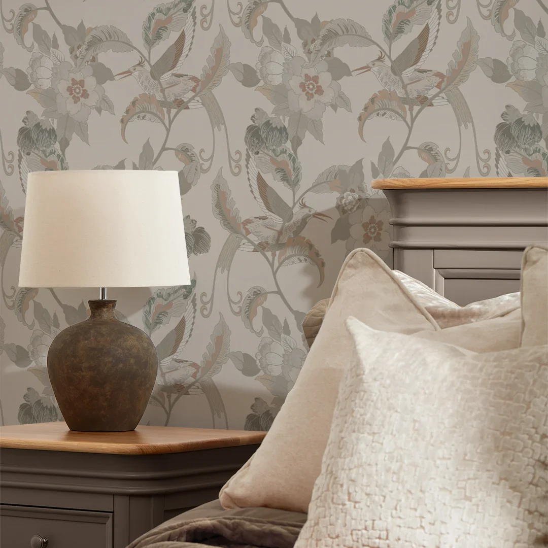 Unwind in a lush forest habitat with Beautiful Birds wallpaper, the perfect leafy addition to any room in your home. This wallpaper creates a natural and calming atmosphere with its large billowing leaves and flowers scattered across a warm neutral background. The birds chirping among the branches add a touch of whimsy and liveliness to the design, almost camouflaging into their surroundings with united peach, grey and brown colours. Whether you use it as an accent wall or cover an entire room, Beautiful Birds wallpaper is sure to elevate the aesthetics of any space. This delightful wallpaper is a must-have for any nature lover or homeowner looking to add a touch of warmth and natural beauty to their home.