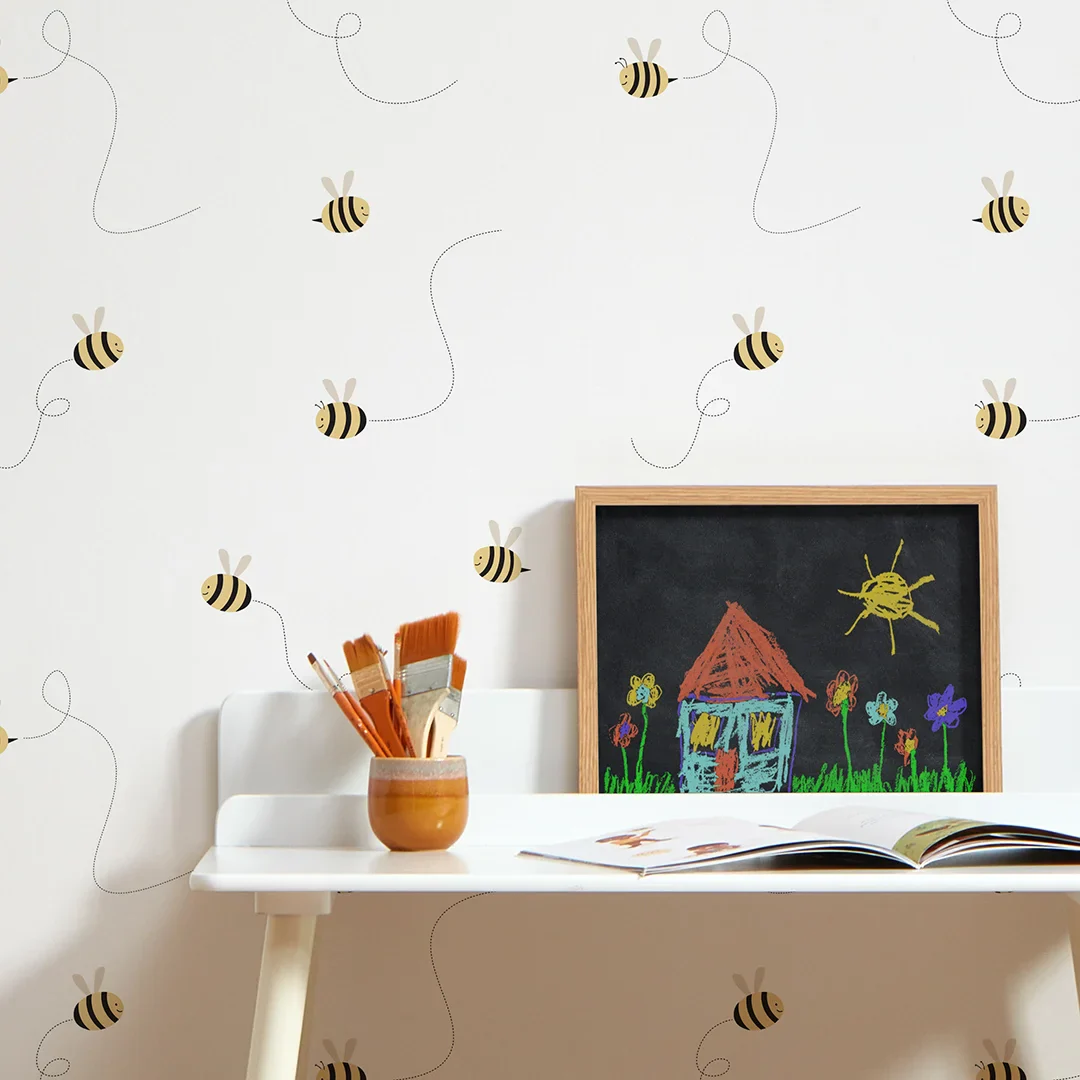 Small yellow bumblebees happily buzz across this delightful wallpaper design. A clean white background and charming bees make it a firm favourite of ours.