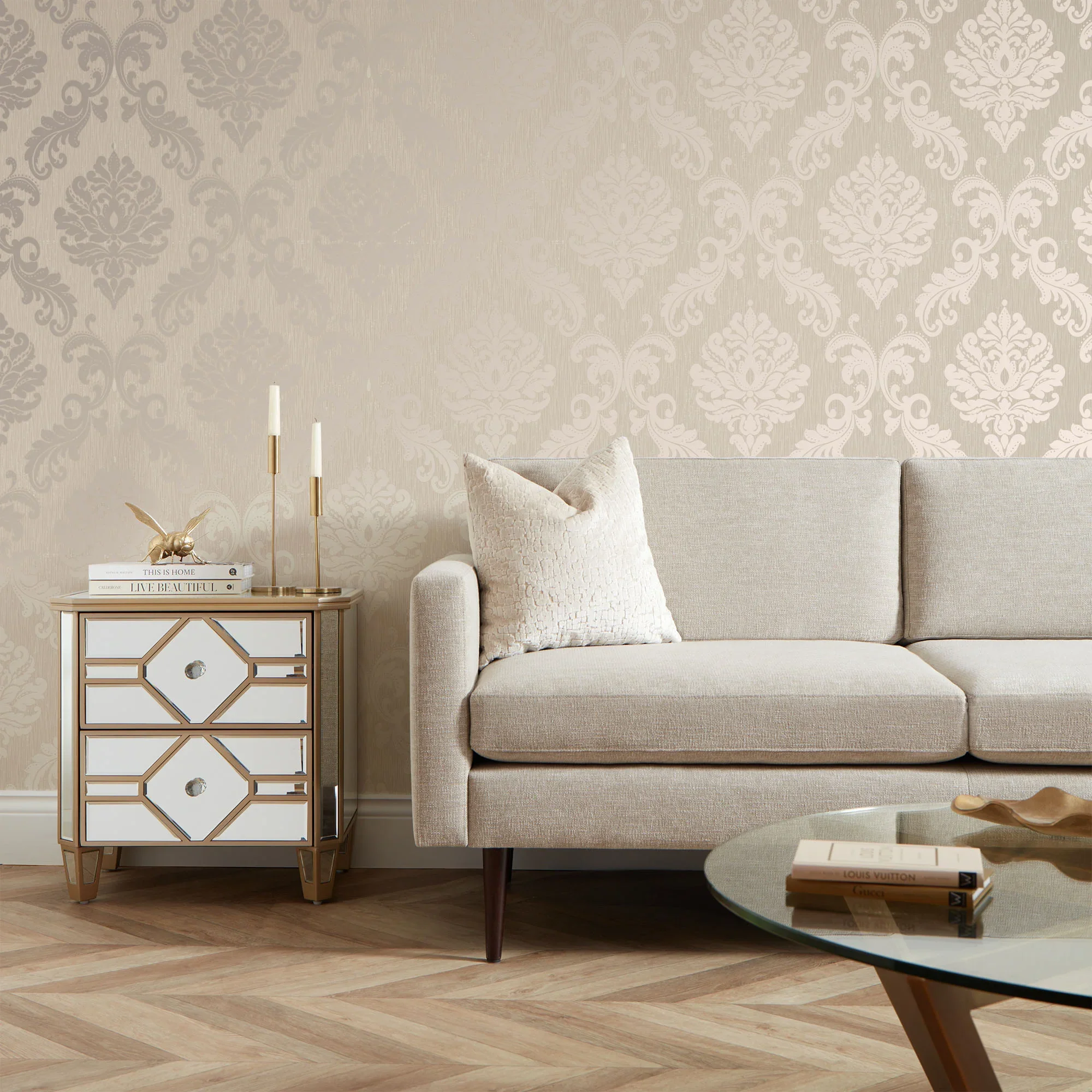 Chelsea Glitter Damask Wallpaper in Cream and Gold
