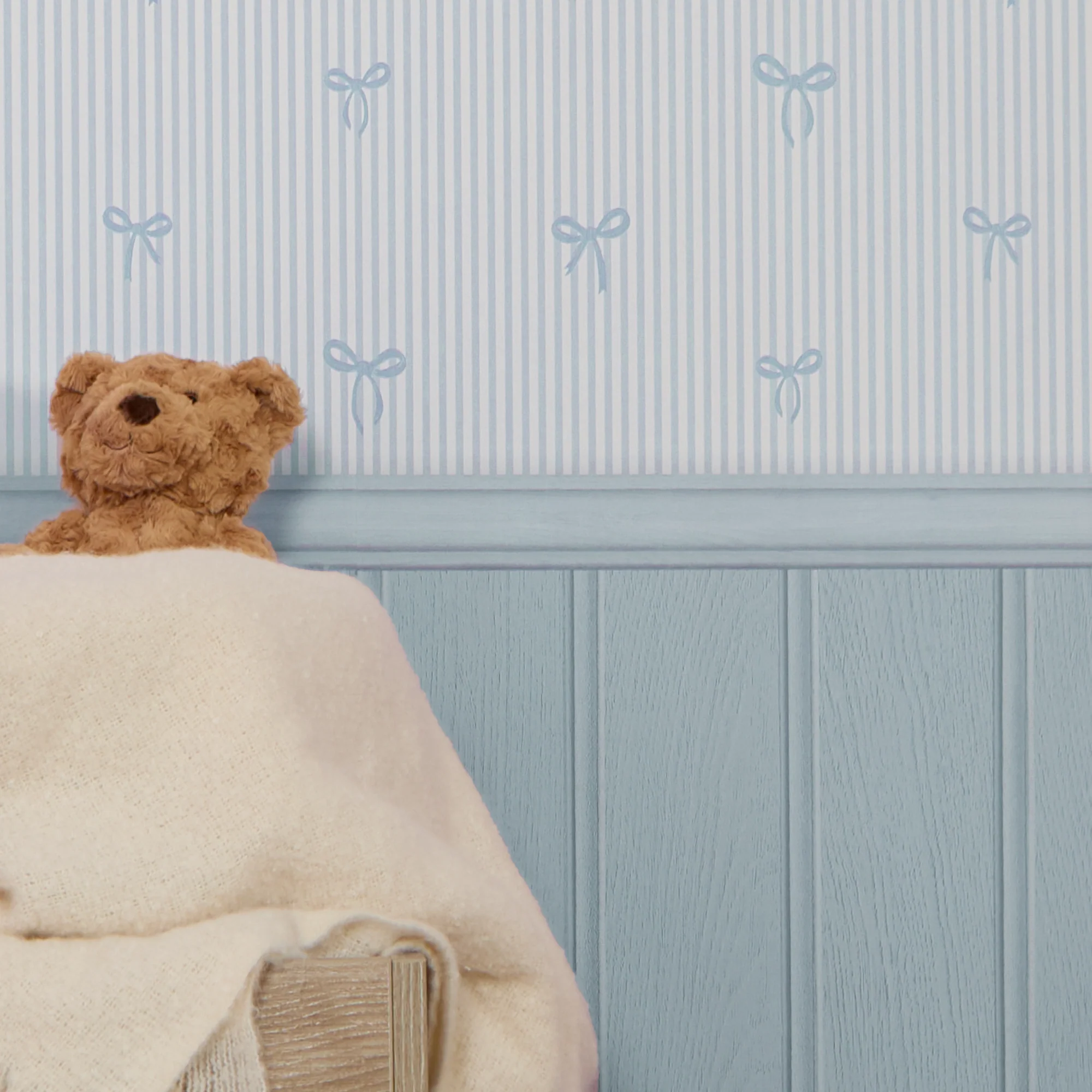 Our Delicate Bows on Pinstripe Panel wallpaper creates a sweet, classic, and slightly whimsical aesthetic. Bathed in a calming blue hue, the design features delicate bow motifs scattered across vertical pinstripes, enhanced by a timeless blue beadboard panel effect. This allows you to achieve the coveted wood panel look affordably. Perfect for creating a sweet, calming atmosphere in nurseries, adding playful energy to playrooms, or lending feminine elegance to dressing rooms, be they for teens or adults. The wallpaper's gentle tonal pink complements our white whisper or ivory spray matt emulsion paint beautifully.