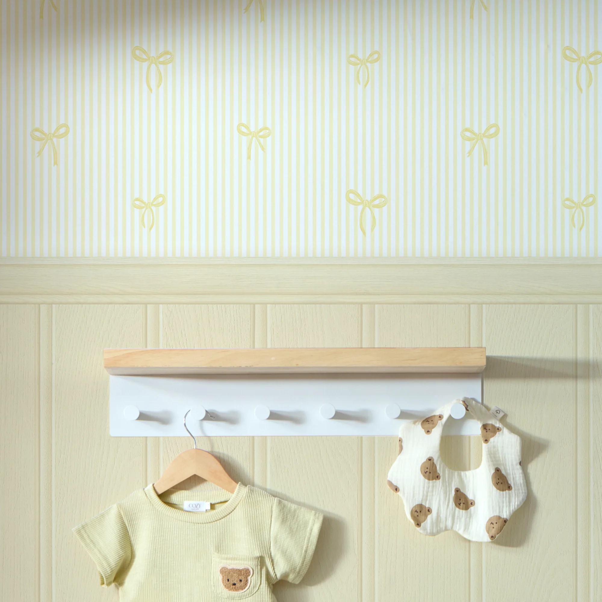 Elegant yet whimsical, our Delicate Bows on Pinstripe Panel wallpaper artfully combines timeless design with a touch of playfulness. A classic pinstripe backdrop sets the stage for delicate bow motifs, all presented in a refreshing white and lemon palette. Enhancing the design is a lemon yellow beadboard panel, providing a cost-effective and fashionable alternative to traditional wood panelling. Versatile by nature, it suits a range of spaces, including children's rooms, playrooms, and dressing areas. For a cohesive and polished look, pair it with our ivory spray or white whisper matt emulsion paint.