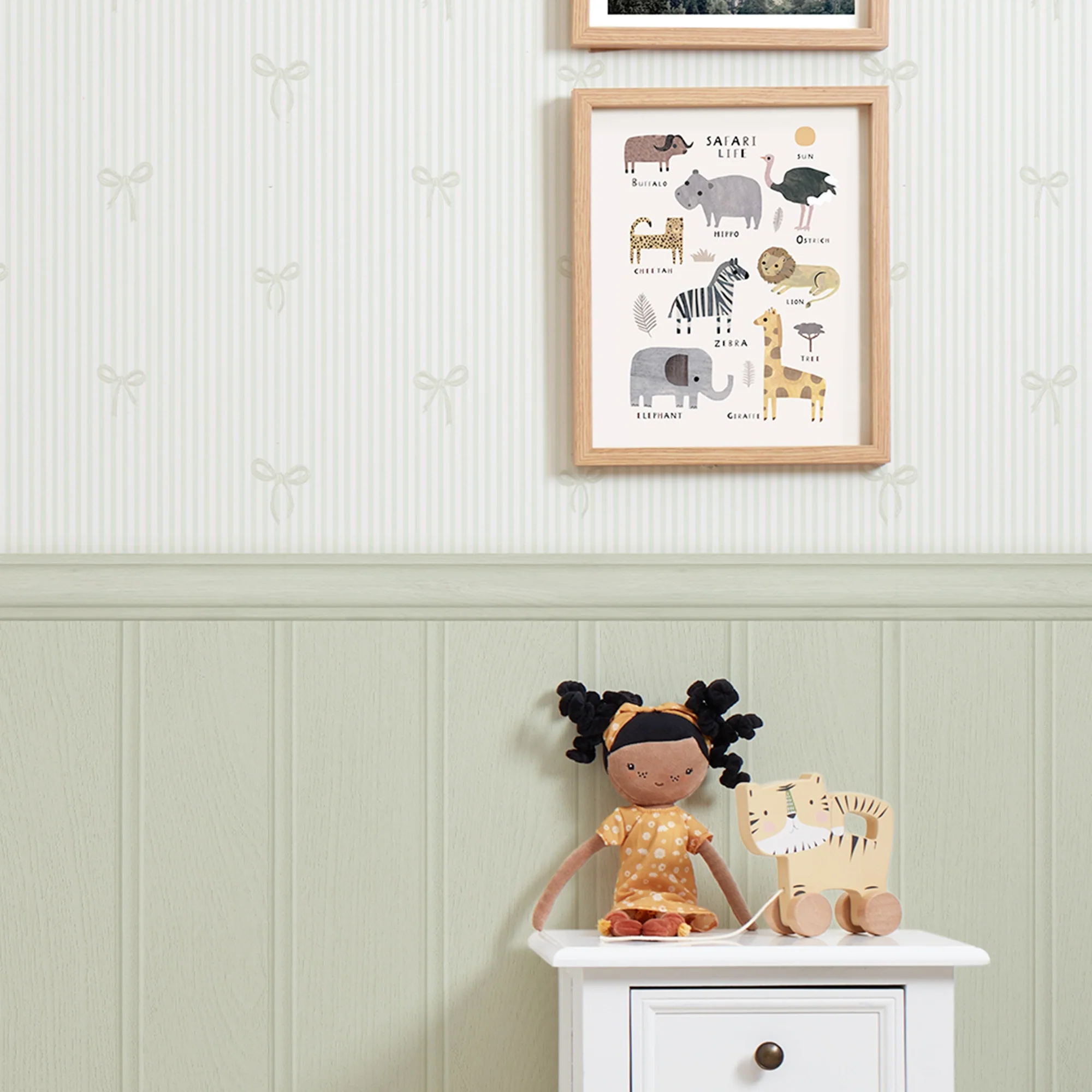 Introducing our Delicate Bows on Pinstripe Panel wallpaper, a design that harmoniously blends traditional sophistication with a charming, playful element. Gentle bow accents are gracefully interspersed along classic vertical pinstripes, all presented on a soothing mint green backdrop. This design is further elevated by a green beadboard panel, offering an economical yet stylish substitute for genuine wood panelling. Perfect for a variety of rooms, from nurseries and play areas to dressing rooms. To achieve a unified aesthetic, consider complementing it with our ivory spray or white whisper matt emulsion paint.