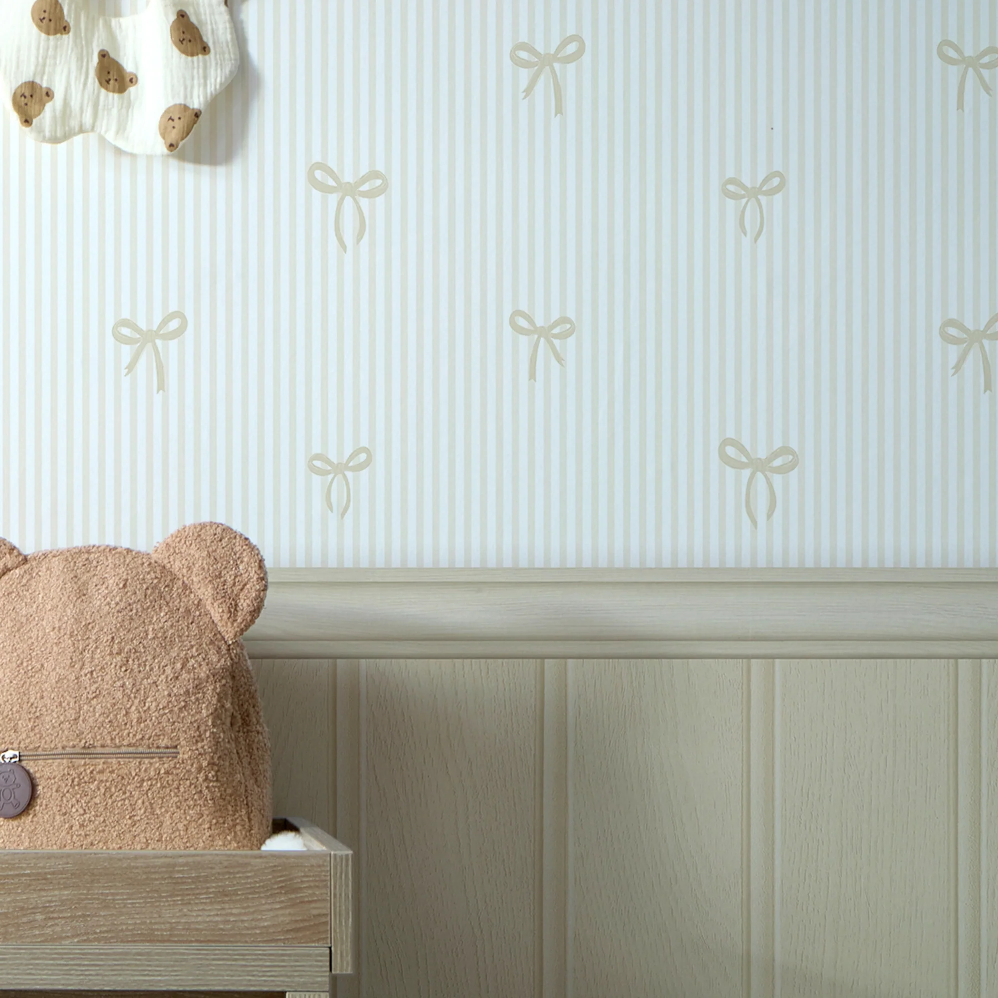 Our Delicate Bows on Pinstripe Panel wallpaper offers a charming blend of classic and whimsical style, perfect for creating a serene atmosphere. Featuring delicate bow motifs scattered across vertical pinstripes, all set against a natural, calming hue, the design is further enhanced by a cream beadboard panel effect, providing an affordable alternative to real wood panelling. Ideal for nurseries, playrooms, or dressing rooms, this wallpaper can add a touch of sweetness, playfulness, or feminine elegance, depending on the space. For a cohesive look, pair it with our ivory spray or champagne cream matt emulsion paint.