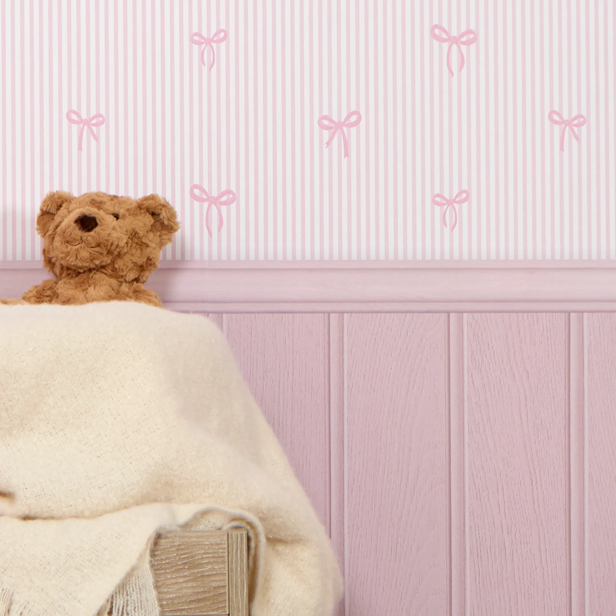 Add a soft, feminine touch to your home with our Delicate Bows on Pinstripe Panel wallpaper in a dreamy pink shade. This beautiful design of delicate bow motifs scattered across a background of vertical stripes with a timeless pink beadboard panel effect lets you achieve the popular wood panel look for less. This charming wallpaper adds a sweet, calming touch perfect for nurseries, playful energy to playrooms, or a touch of feminine elegance to teen or adult dressing rooms. The sweet tonal pink of this wallpaper complements our ballet slipper matt emulsion paint.