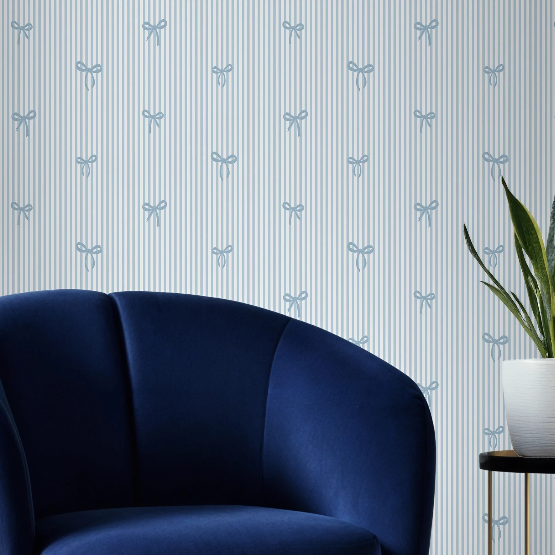 Delicate Bows on Pinstripe Wallpaper in Blue