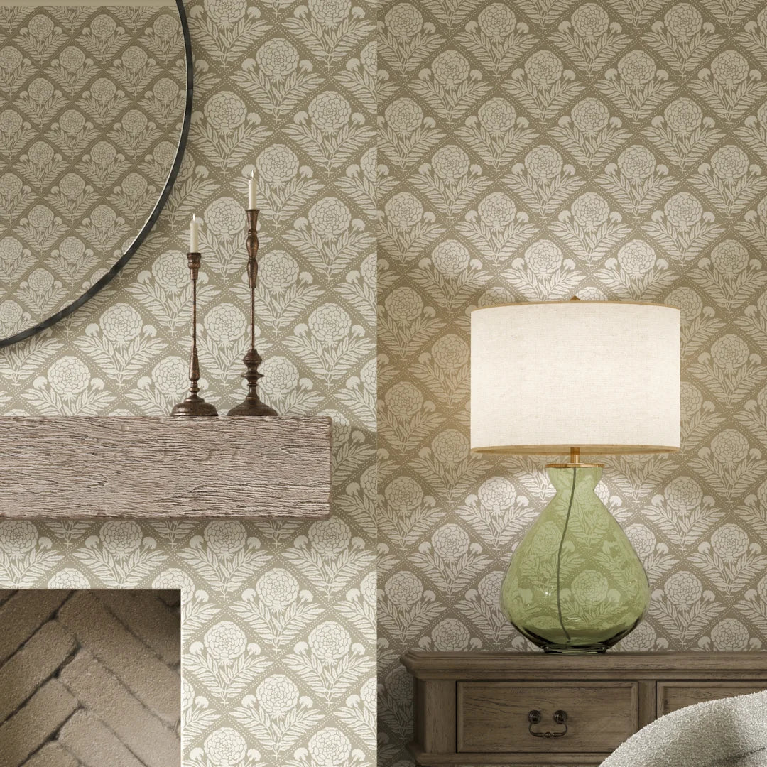 Like a pretty needlepoint sampler, our delightful Garden Tapestry wallpaper radiates handcrafted allure. A background of neutral taupe is adorned with a repeating pattern of white flowers framed in diamonds by delicate dotted lines. Its subtle, duo-tone colour palette and intricate detailing evoke a rustic mood, creating a space that feels both lovingly curated and effortlessly stylish. Use this tapestry wallpaper in living rooms, dining rooms and hallways to infuse your spaces with cosy cottage charm. Finish the look with accents of muted greens or soft blues through cushions, vases or artwork to bring a touch of colour that resonates with Garden Tapestry’s natural elegance.