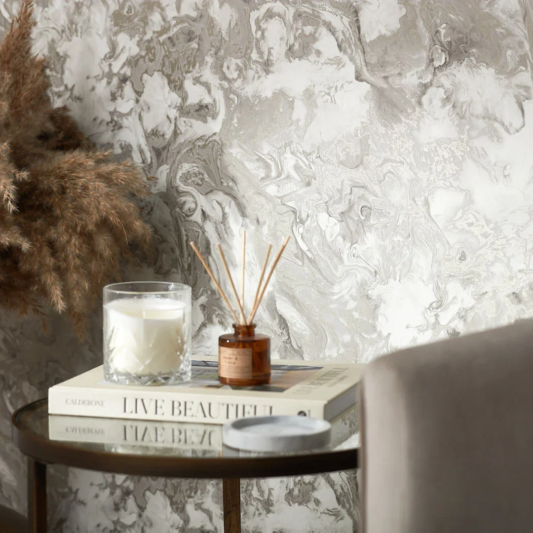 Loved by you, our bestselling Liquid Marble design is extra luxurious in our taupe and silver colourway. This easy-to-hang wallpaper has a swirling marble pattern with a hint of metallic. Make this marble wallpaper a feature in your bedroom or living room.