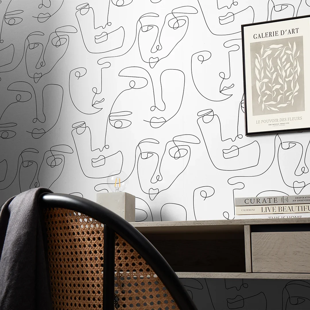 Enchanting line art faces, Pablo is an elegant and contemporary wallpaper design in a chic monochrome style. This abstract pattern would look wonderful in a living room or home office space.