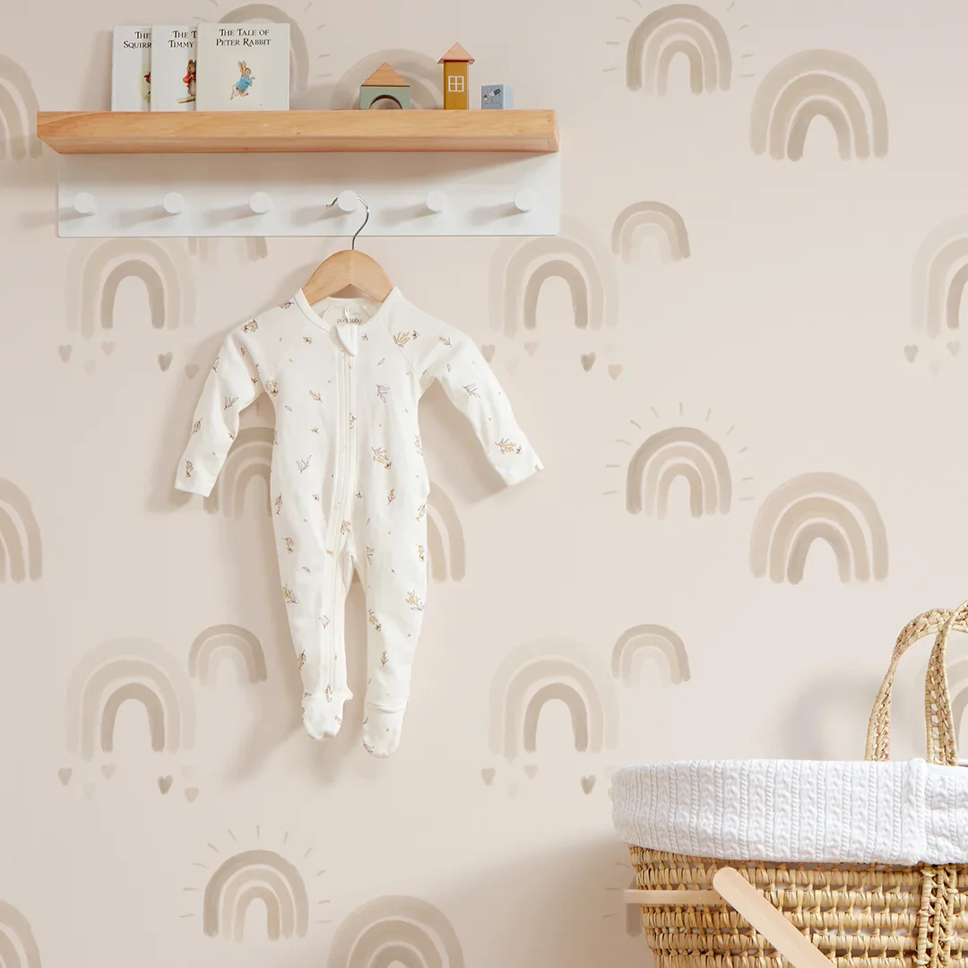 Why chase the rainbow when you can bring them into your home to admire daily? Bring an adorable canvas of neutral colours to a child’s bedroom with this rainbow aesthetic wallpaper. The dainty rainbows are designed with a light watercolour effect, and the individual brush marks of the rainbows are finished off by tiny hearts that add a cute boho feel. The unimposing colour scheme features subtle and soothing shades of coffee brown, grey and beige. Perfect for hanging in a neutral modern bedroom or nursery.