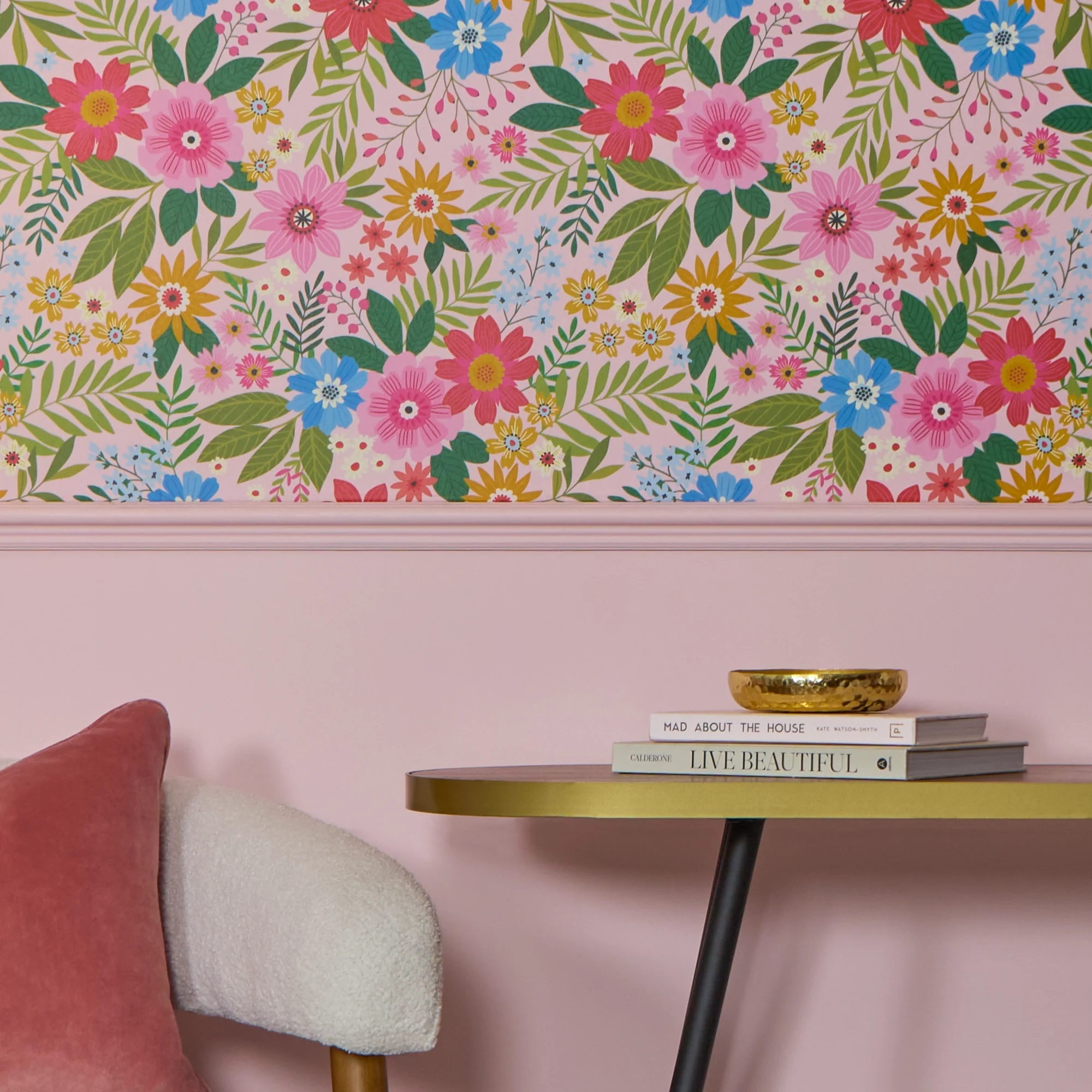 Infuse your space with joy using this cheerful Perfect Petals wallpaper. Its lively pattern of brightly coloured flowers and rich green leaves creates an inviting atmosphere, bringing a touch of nature's exuberance and charm to your home. Complement with our Classic Stripe wallpaper in Pastel Pink or for a more subdued look pair with our Ivory Spray matt emulsion paint.